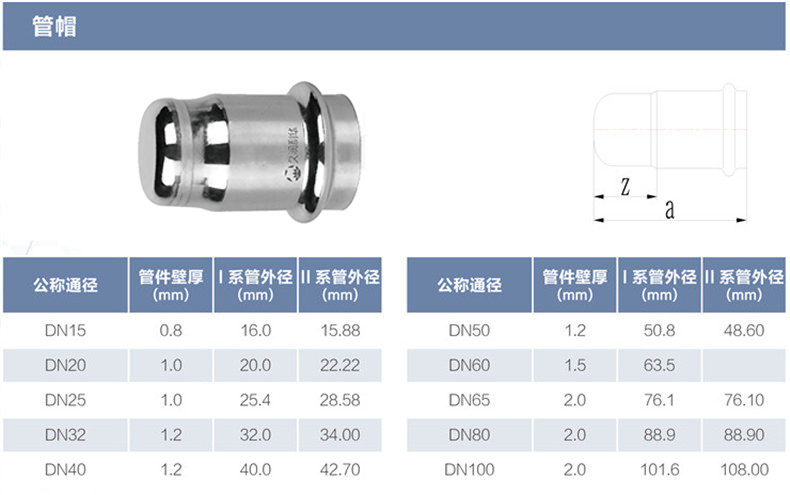 管帽丨材質(zhì)(Grade): 304/304L、316L 丨原料來源(Source of raw materials): 全部符合相關(guān)國家標(biāo)準(zhǔn)要求,用料來源酒鋼、太鋼、張浦、東特等 丨焊接方式(Welding method): 氬弧焊或等離子焊(TIG OR PLASMA在線)+氬弧焊(TIG離線) 丨執(zhí)行標(biāo)準(zhǔn)(Executive standard): GB/T 19228.2-2011 GB/T12771 丨參數(shù)對照表(Parameters):