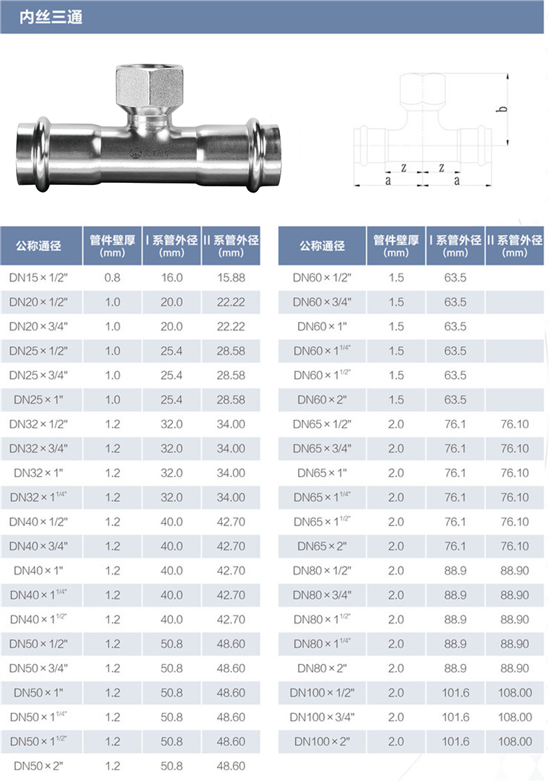 內(nèi)絲三通丨材質(zhì)(Grade): 304/304L、316L 丨原料來源(Source of raw materials): 全部符合相關(guān)國家標(biāo)準(zhǔn)要求,用料來源酒鋼、太鋼、張浦、東特等 丨焊接方式(Welding method): 氬弧焊或等離子焊(TIG OR PLASMA在線)+氬弧焊(TIG離線) 丨執(zhí)行標(biāo)準(zhǔn)(Executive standard): GB/T 19228.2-2011 GB/T12771 丨參數(shù)對照表(Parameters):